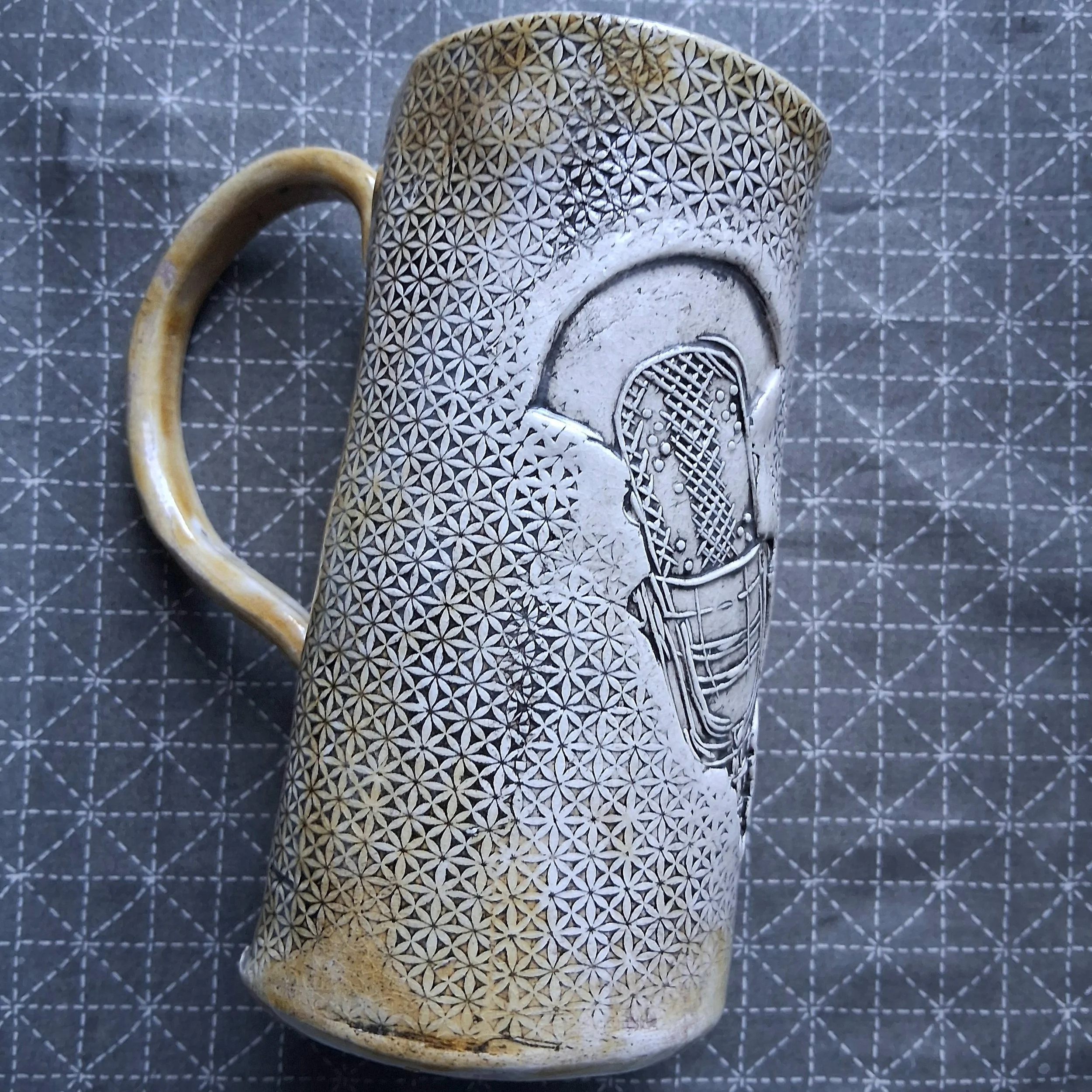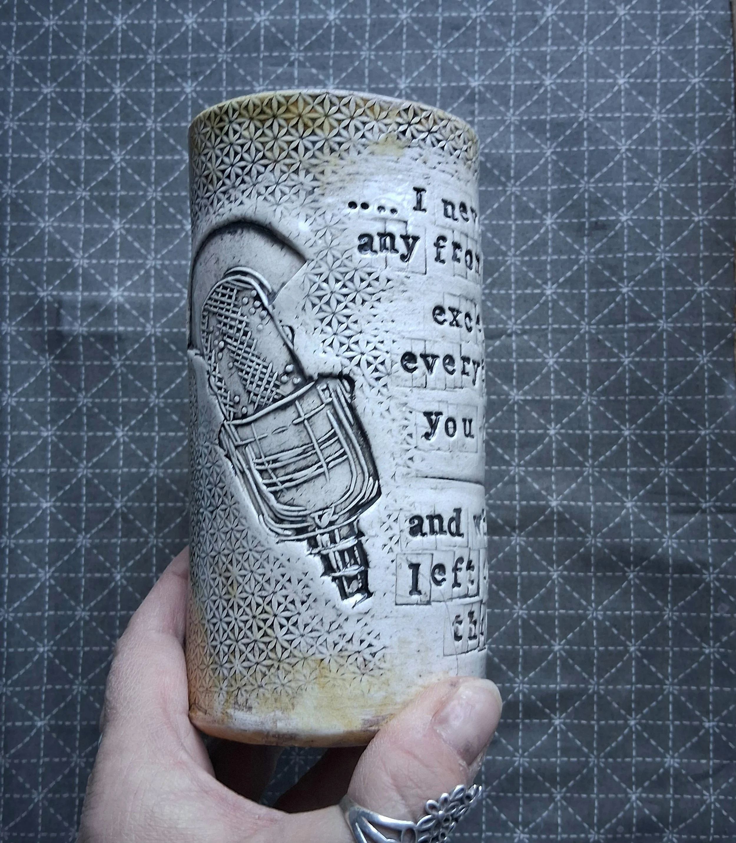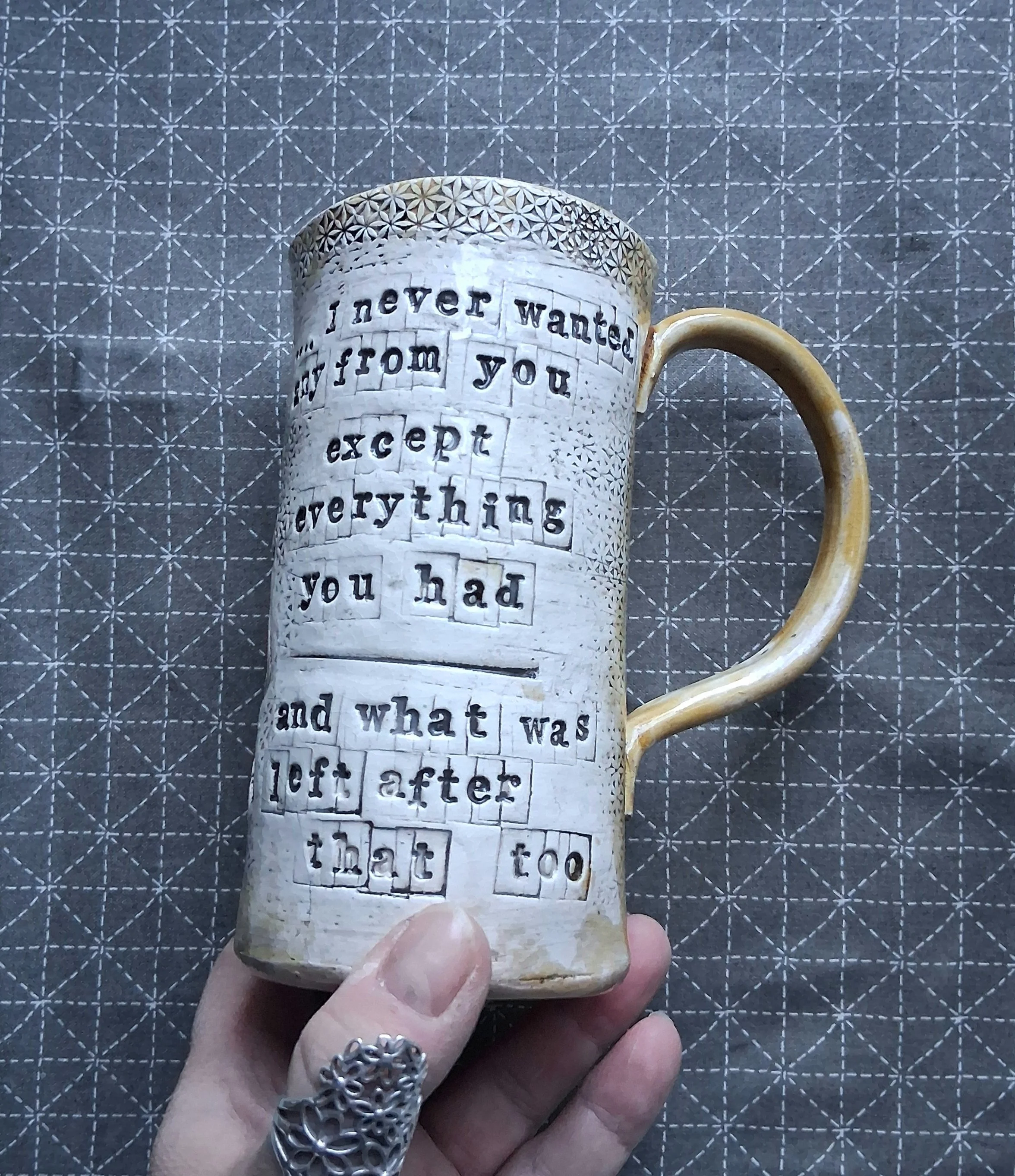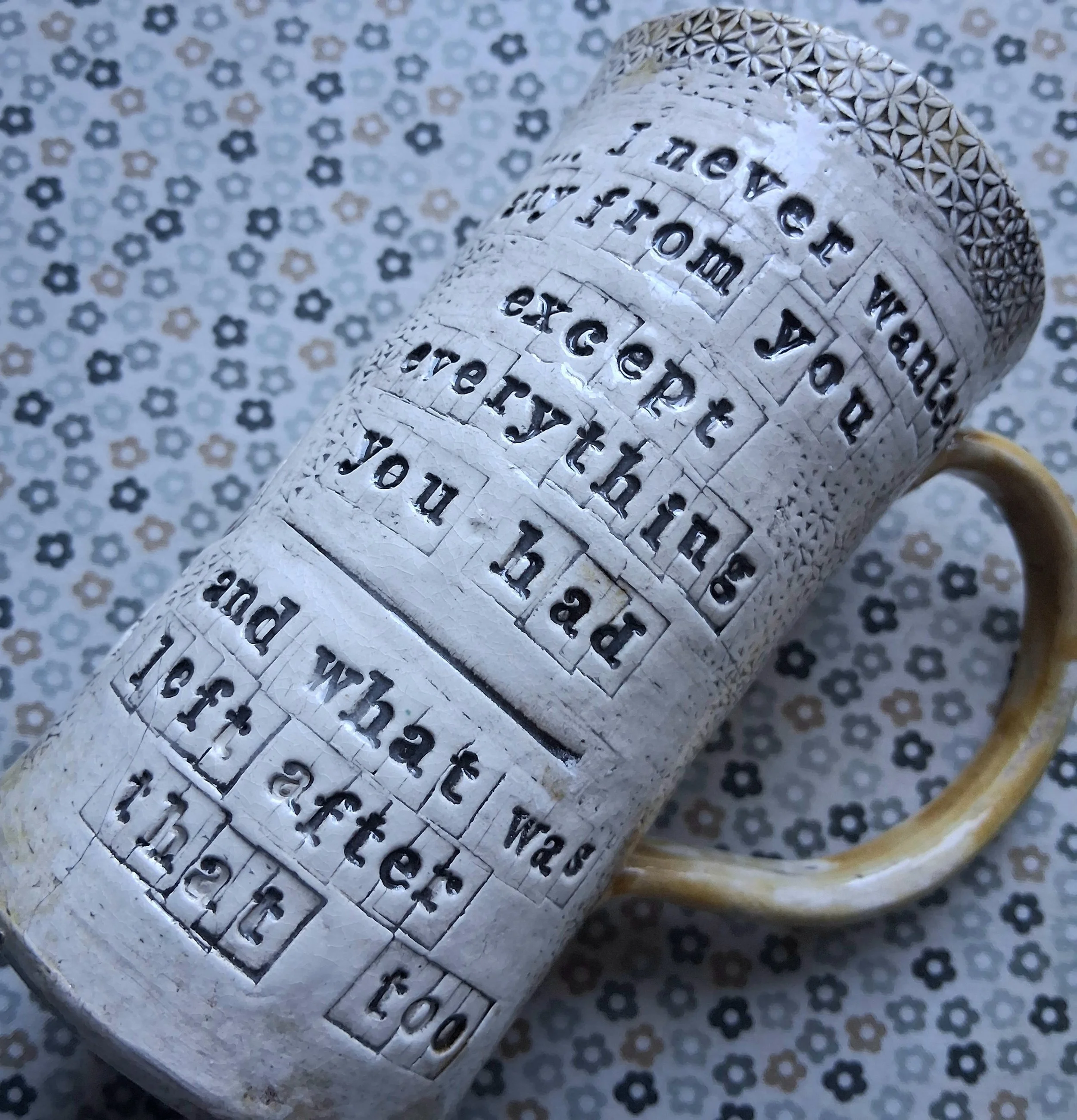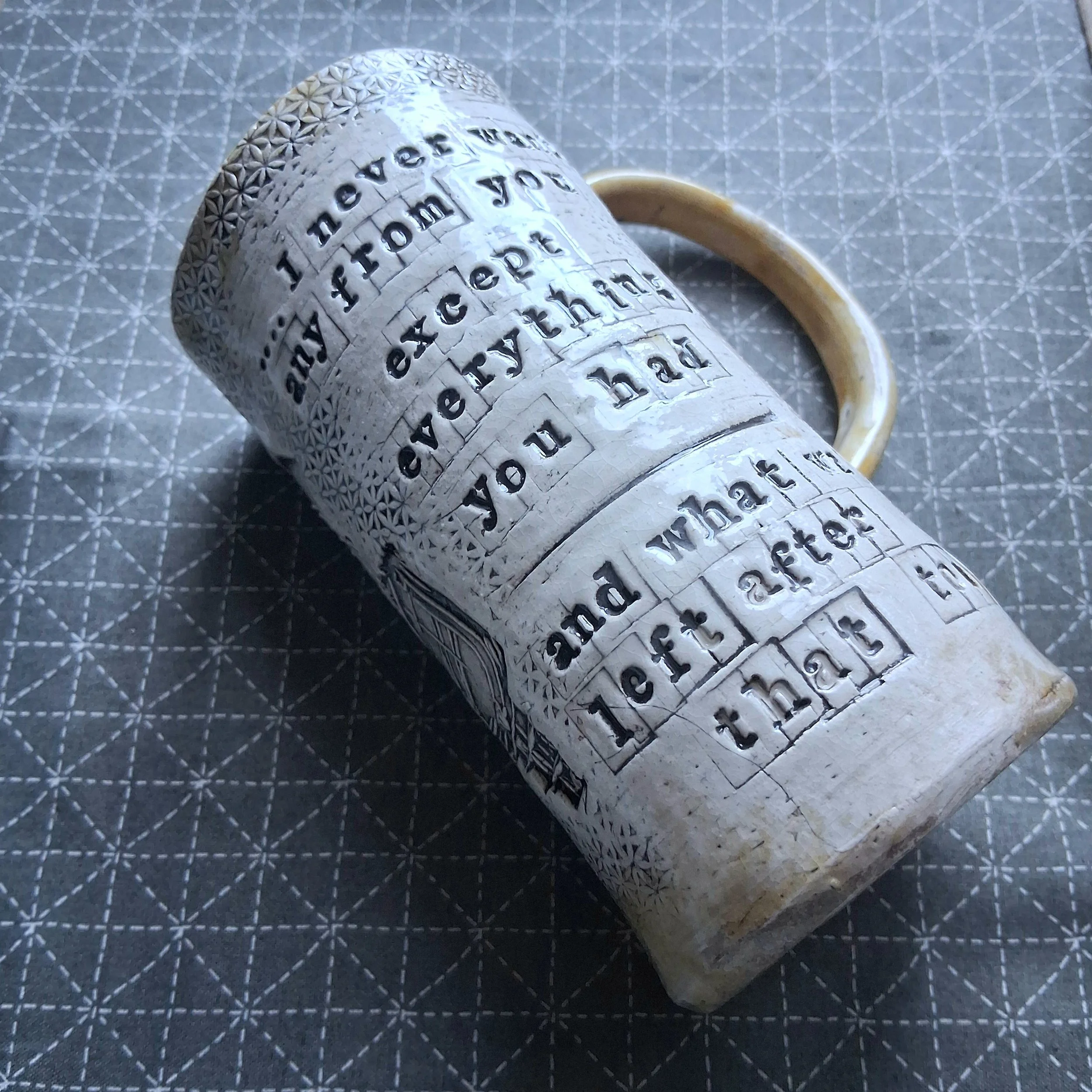This xl mug has a printed linocut of a vintage microphone paired with the song lyrics of your choice, the glaze is a soft yellow (green coming shortly) with clear glaze over the design etc