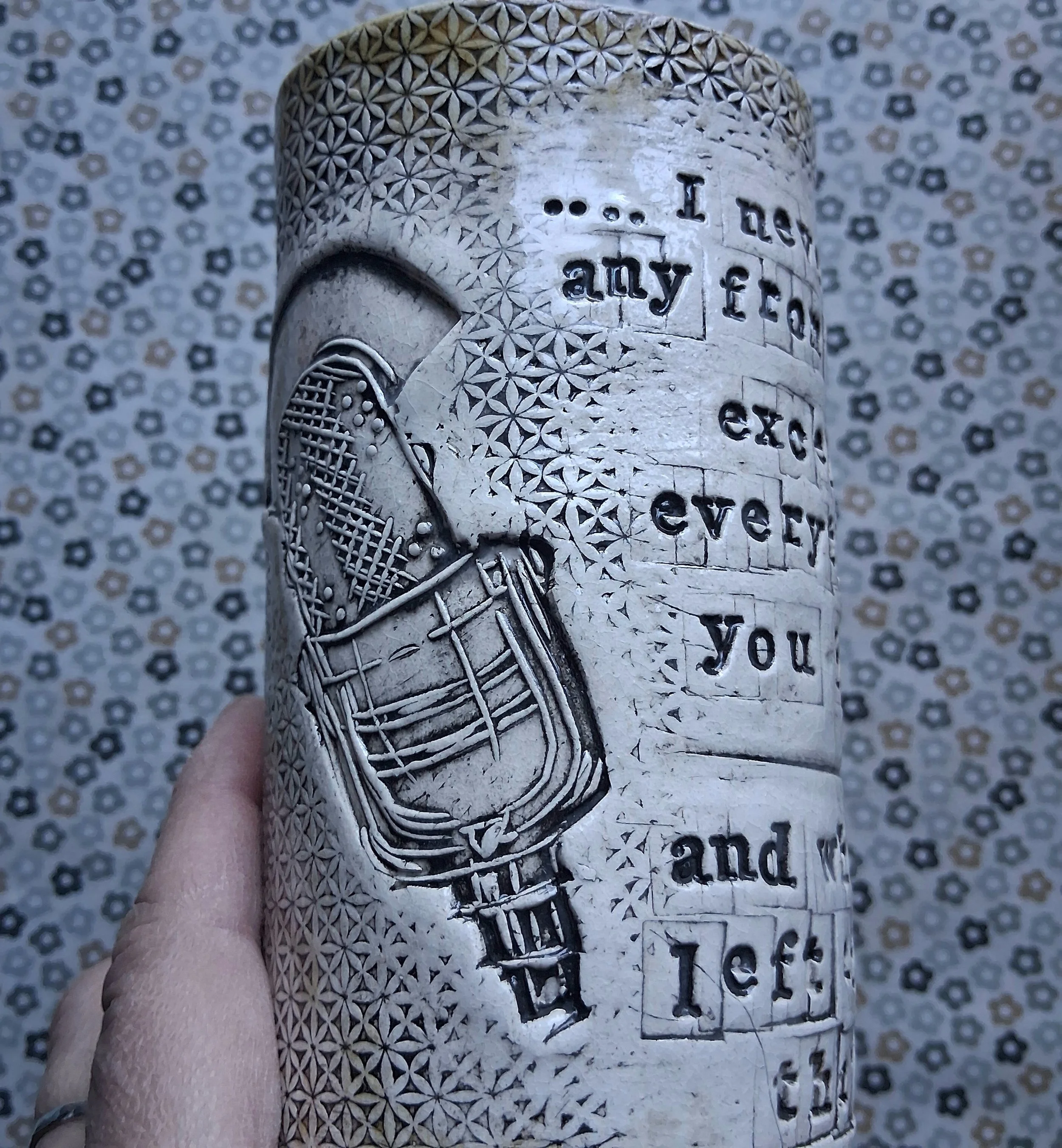 Made from stoneware clay to be lighter and stronger. Instead of being wrapped around a mould and trimmed, handformed pottery has raw edged and curved into shape to make a gentler circle thats different every time, making them more tactile allowing for more movement in the glaze. I decorate my pottery with hand carved linocuts or hand stamped text, then highlight these with black underglaze then apply glazes to make them waterproof dishwasher proof and even suitable for the microwave.